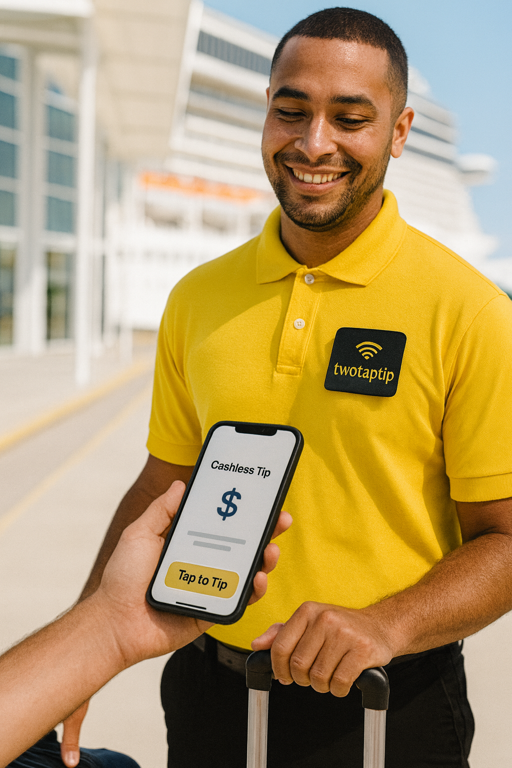 Each staff member wears a smart, NFC-enabled badge with a QR code. Guests simply tap the badge with their phone (or scan the QR) to leave a secure tip — no cash or app required. Tips are instantly processed and sent directly to the worker.